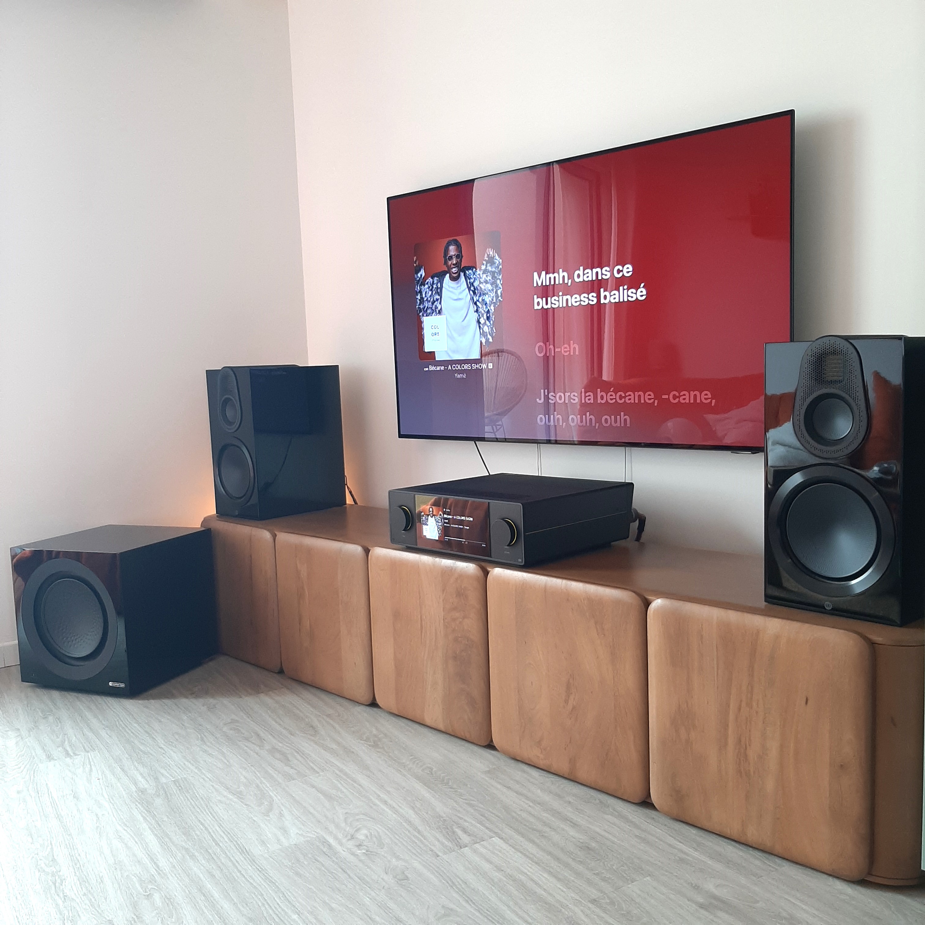 Si l'ensemble est presque « surdimensionné » par rapport à la taille de la pièce, c'est parce que nos clients souhaitaient anticiper l'avenir, et investir dans une chaîne qui pourrait les suivre dans leur future maison. Très élégant dans sa finition noire laquée, ce système est redoutable de précision et de dynamique, et ce, y compris à un volume d'écoute très raisonnable. Mais, à l'inverse, ce dernier est capable d'un grand réalisme si on le pousse un peu, quitte à faire un peu trembler les murs... Merci à notre jeune couple pour leur confiance.