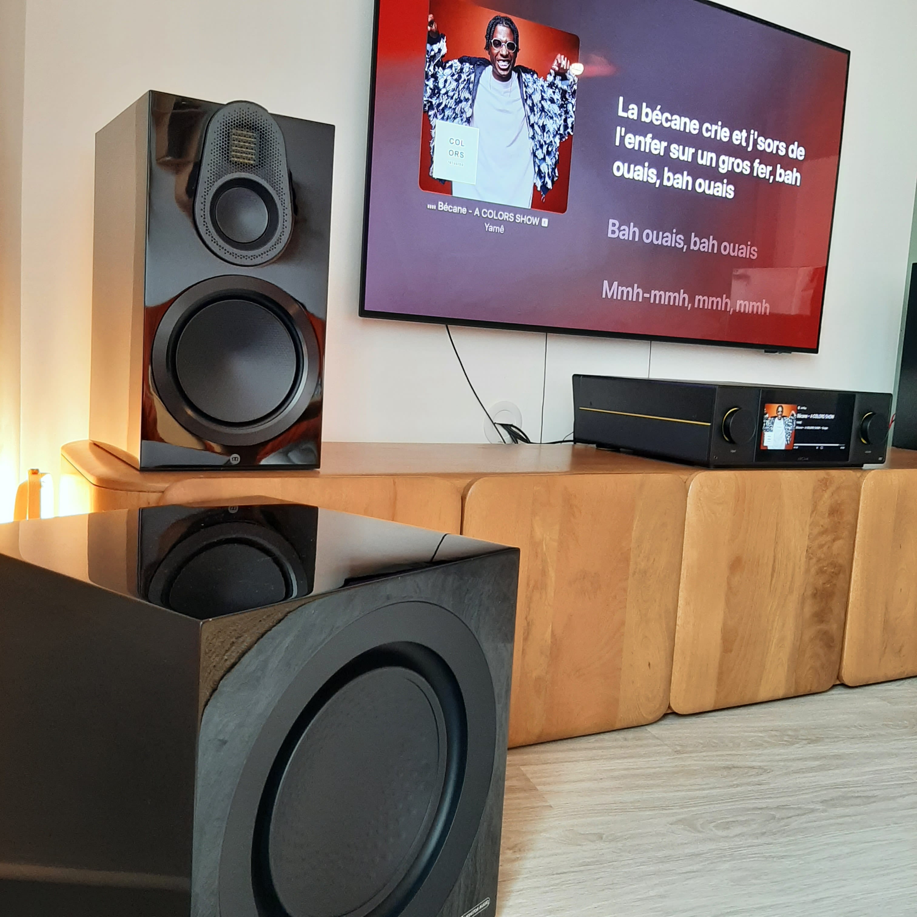 Côté ampli, notre couple souhaitait un appareil « tout-en-un », afin de ne pas multiplier les appareils et surcharger la décoration. Après quelques écoutes et comparaisons, le budget du couple nous permit d'opter pour un amplificateur connecté Arcam Radia SA45, fleuron de la marque, qui, avec ses confortables 2x180w sous 8ohms, s'est révélé plus qu'à-même de faire chanter les Monitor Audio. Le caisson Anthra W12 vient apporter le relief nécessaire aux écoutes à bas niveau.