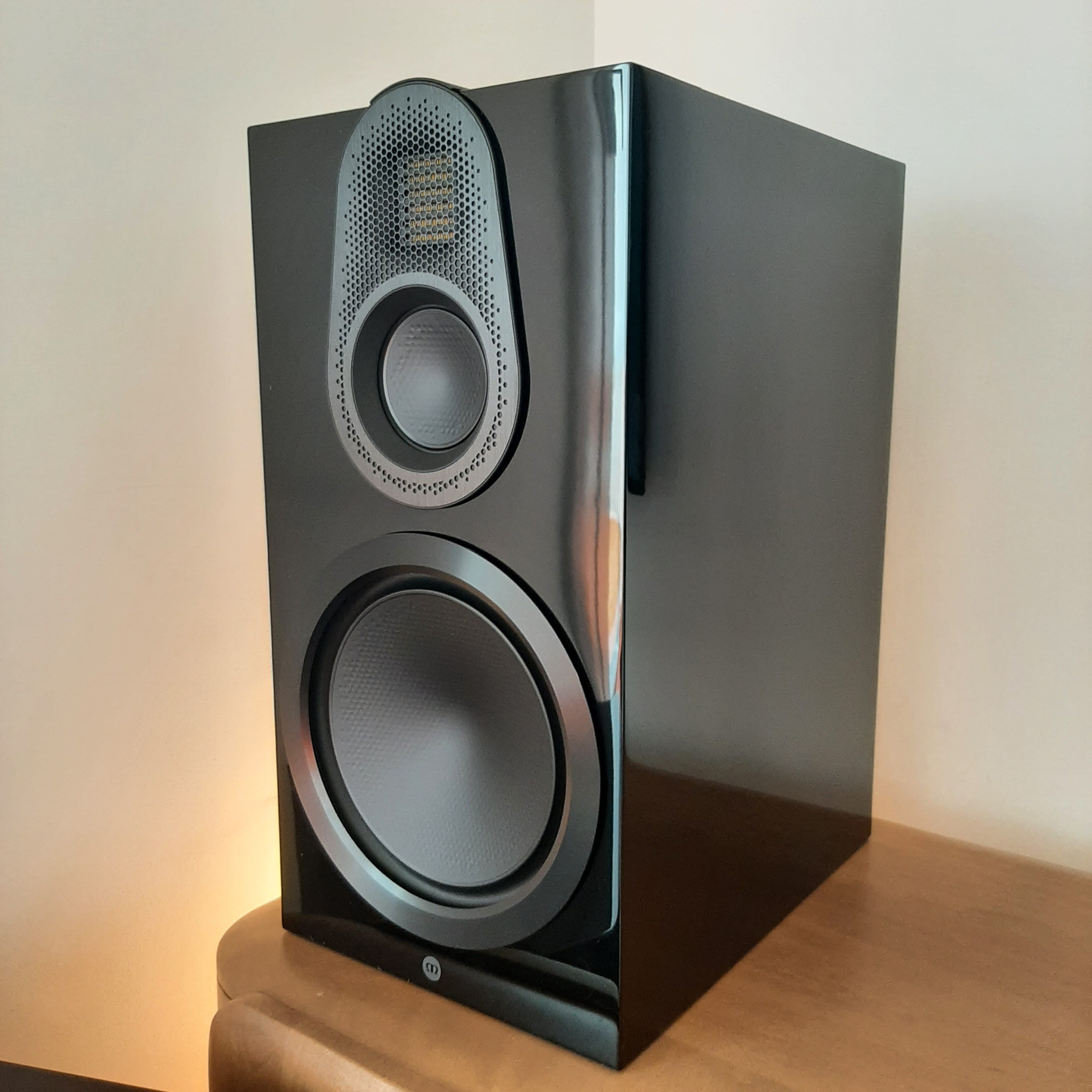 La contrainte d'espace dans leur salon ne permettait cependant pas d'intégrer des enceintes colonnes, et les enceintes ne pouvaient qu'être posées sur le meuble TV. Nous avons donc opté pour des enceintes bibliothèques, épaulées par un caisson de basses efficace. Après plusieurs passages et sessions d'écoutes au magasin - ainsi que chez des concurrents - leur choix s'est porté sur les enceintes bibliothèque Monitor Audio Gold 100 6G, assistées par le caisson Monitor Audio Anthra W12. L'ensemble a été choisi en finition Black Gloss, afin de contraster joliment avec le très beau meuble en bois qui les accueille.